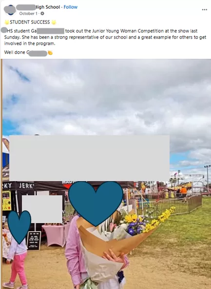 Sharon shared a post from G’s high school announcing that G head won the “Junior Young Woman Competition” at the local show. The post adds that G “has been a strong representative of our school and a great example for others to get involved with the program.”